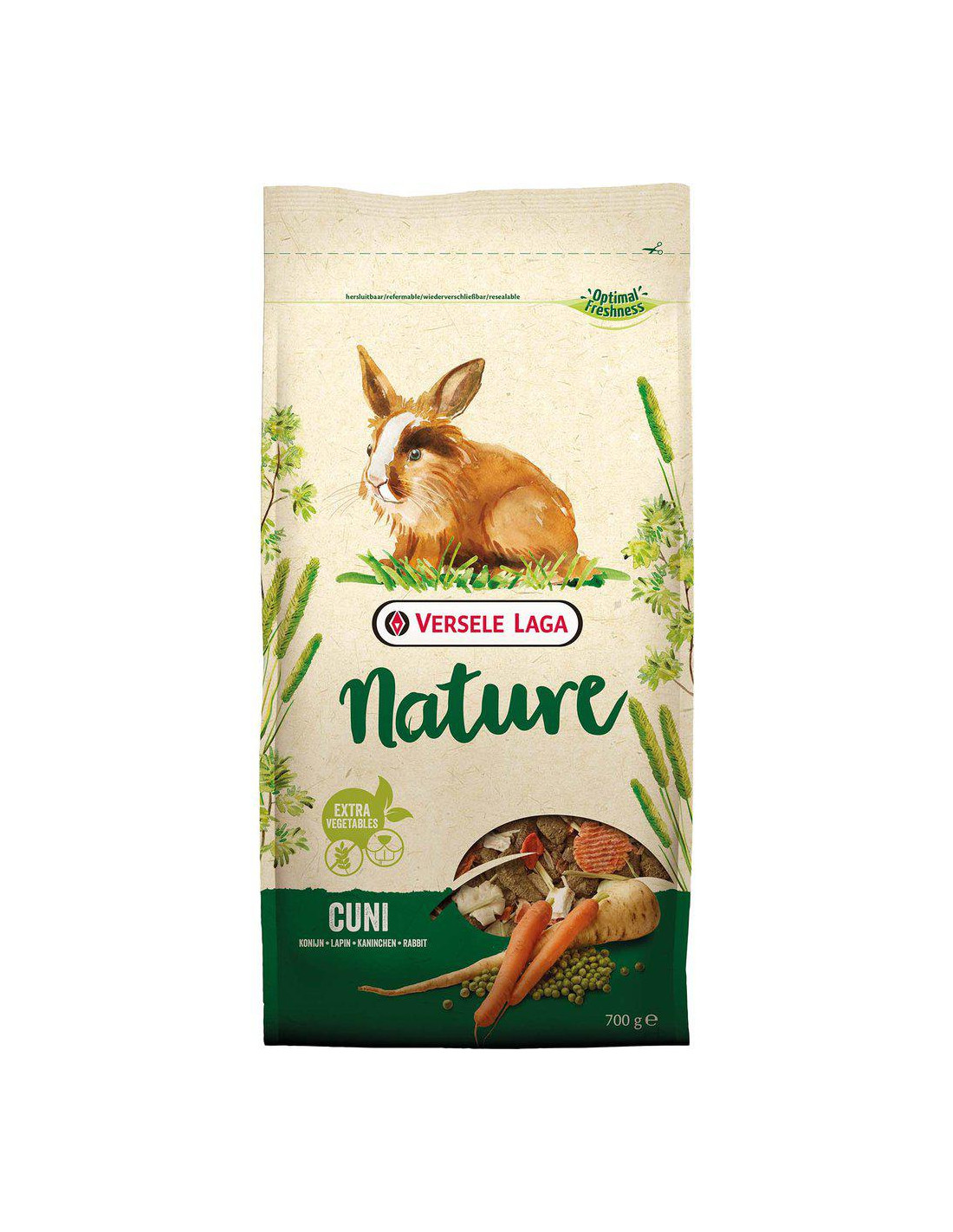 Sammansättning: Vegetabiliska biprodukter (timotej, gräs och örter 23 %), grönsaker (ärtor 12,5 %, morötter 6,3 %, palsternacka 2,6 %), frukt, frön, vegetabiliska proteinextrakt, mineraler, oljor och fetter, MOS, FOS, ringblomma, alger, yucca. Analytiskt innehåll: Protein 14,5 %, fettinnehåll 3,5 %, råfiber 16,5 %, råaska 8,5 %, kalcium 0,75 %, fosfor 0,6 %. Tillsatser/kg; Näringstillsatser: Vitamin A 11850 IE, vitamin D3 1400 IE, vitamin E 95 mg, vitamin C 25 mg, 3b103 (järn) 118 mg, 3b202 (jod) 2 mg, E4 (koppar) 12 mg, 3b502 (mangan) 88 mg, 3b603 (zink) 83 mg, E8 (selen) 0,23 mg. Teknologiska tillsatser: Antioxidanter. Användarinstruktioner: Beroende på storlek och ras rekommenderas en genomsnittlig daglig portion av 50 till 100 g för en kanin.