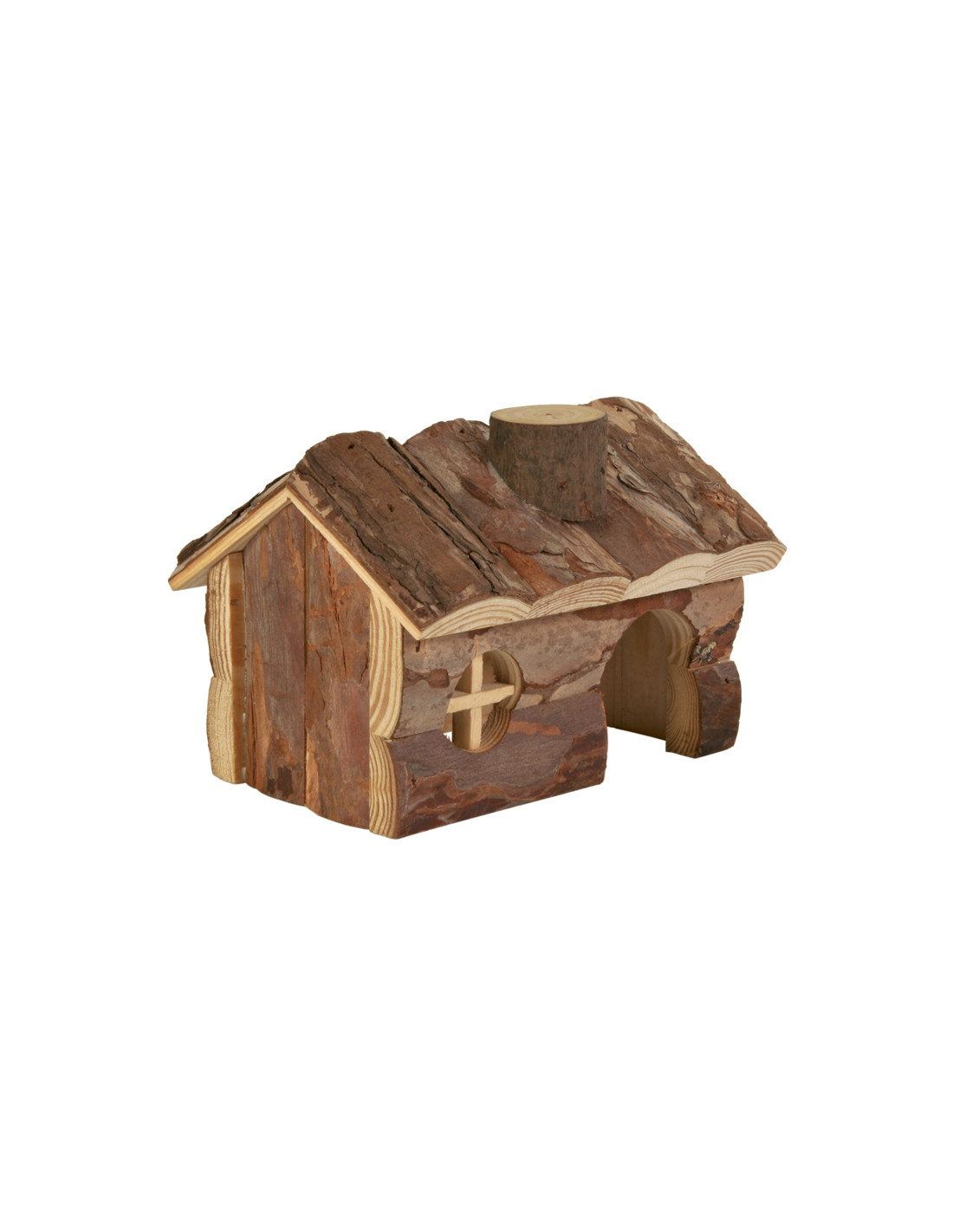 • Hamsterhus i naturträ med fönster och skorsten.