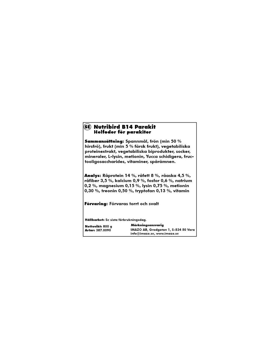 Protein 14%, fettinnehåll 8%, råfiber 5,50%, råaska 7%, kalcium 0,90%, fosfor 0,60%, metionin 0,35%, lysin 0,75%, treonin 0,50%, tryptofan 0,15%, cystin 0,25%